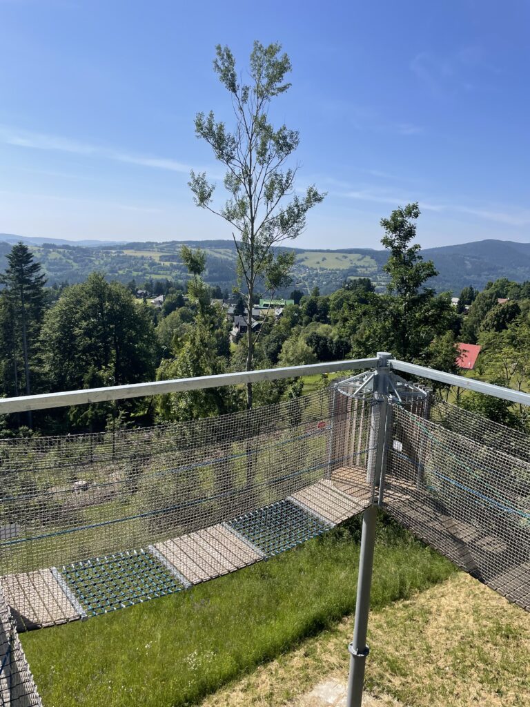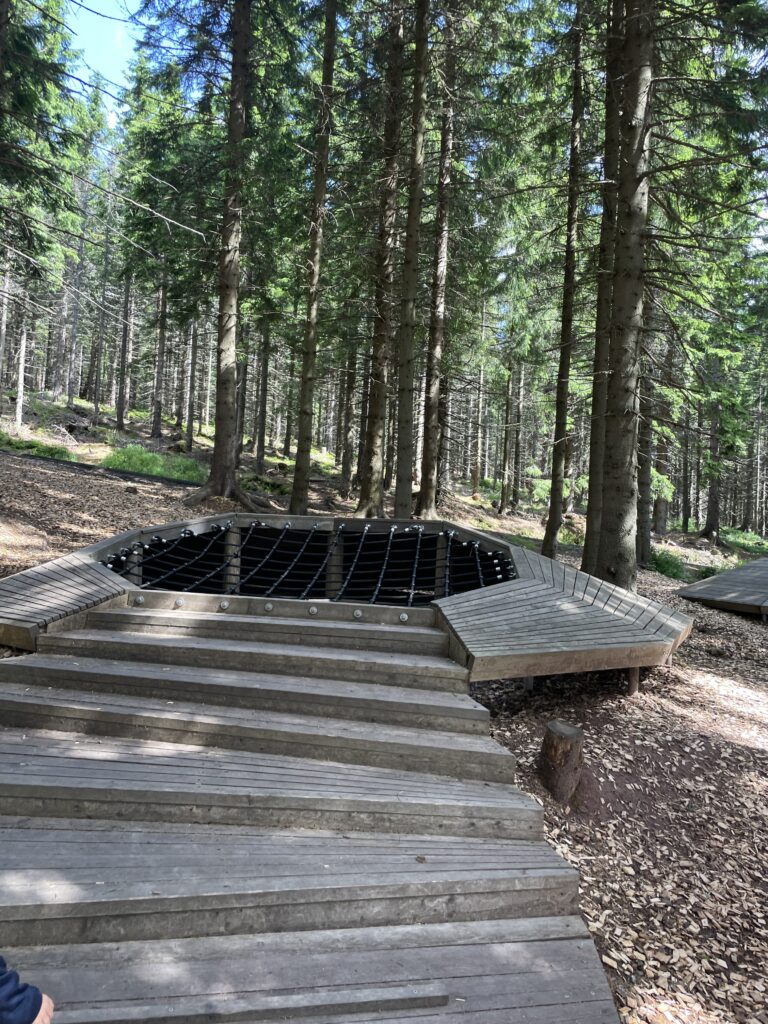 My jsme měli kočárek, takže zpět do Špindlu jsme vyrazili po Bucharově cestě přes Horní Mísečky, dále Vodovodní cestou až do Špindlu. Mapku přikládáme :). Na začátku jsme se ale ještě po Medvědí cestě vydali okouknout dřevěné chodníčky, které jsou cca 800 m od horní stanice lanovky, pak jsme se vrátili zpět. Jen doporučujeme mít opravdu terénní kočárek. Ke konci cesty se jde po sjezdovkách z opravdu prudkého kopce (takže brzda je must have :D). My si ještě u rozcestí (Horní Mísečky – rozběžiště) kousíček zašli a okoukli starou lanovku na Sněžku, která je u „Stopa bufet a restaurace“, kde je mimo jiné i trampolína.