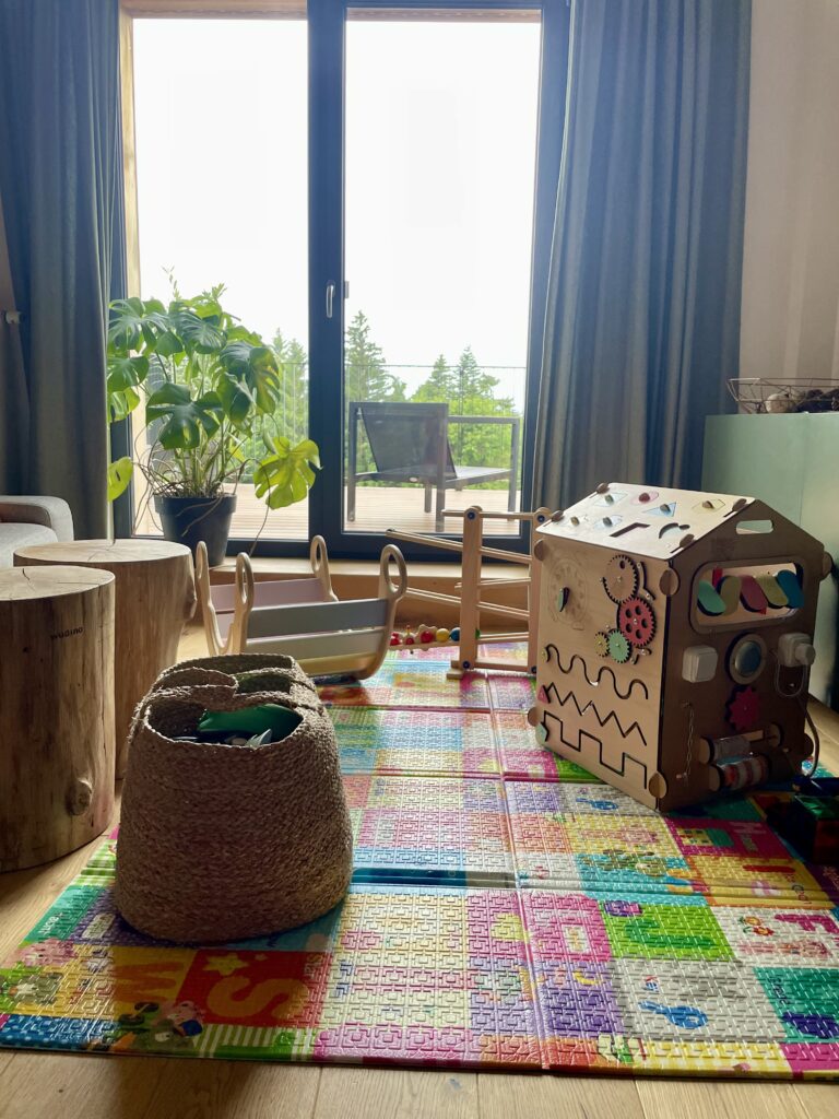 • koš s hračkami (zatloukadla, doktorský kufřík, nářadí, pěnové kostky atd.), knížky, hry, skládačky, dřevěná kuličkodráha, houpačka a aktivity domeček