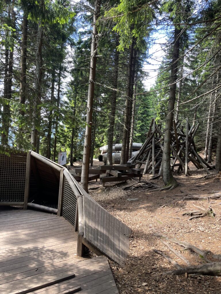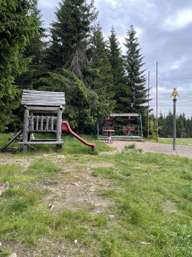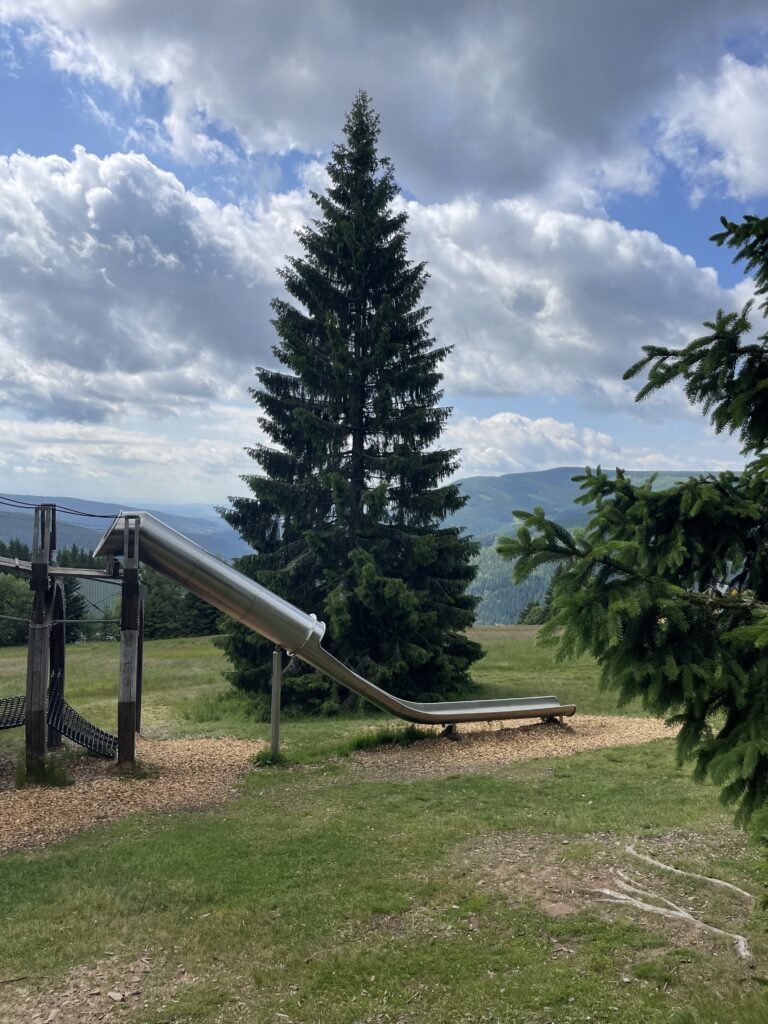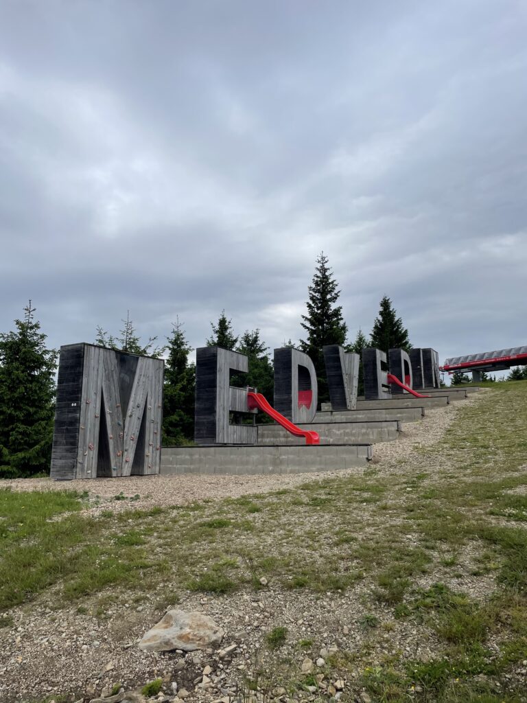 Po výstupu vás uvítá velké „letteringové“ hřiště – obří písmena, klouzačky, prolézačky, vzduchová trampolína, originální kyvadlová houpačka a to všechno s krásnými výhledy. Přímo u horní stanice lanovky je i občerstvení a WC. Také si tu můžete dojít pro razítko a vyzvednout „pracovní list“ k dětské trase MEDVĚDÍ STEZKA.