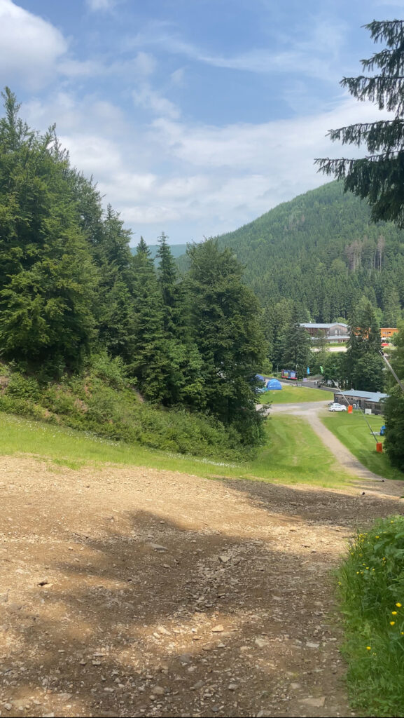 Startujete v centru Špindlerova Mlýna, odkud jedete čtyřsedačkovou lanovkou na Medvědín (1 235 m). Parkoviště přímo pod lanovkou za 250 Kč/den. Lanovka je prostorná a přepravuje i kočárky zdarma . Na konci června jezdila v intervalu a 30 minut, tak se mrkněte, ať nemusíte čekat :).