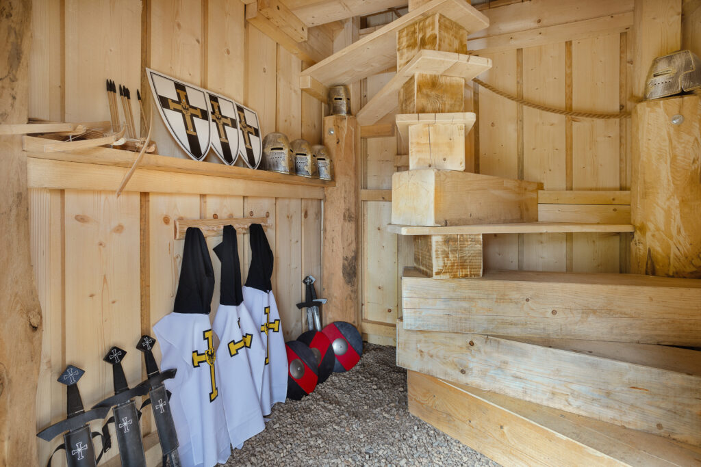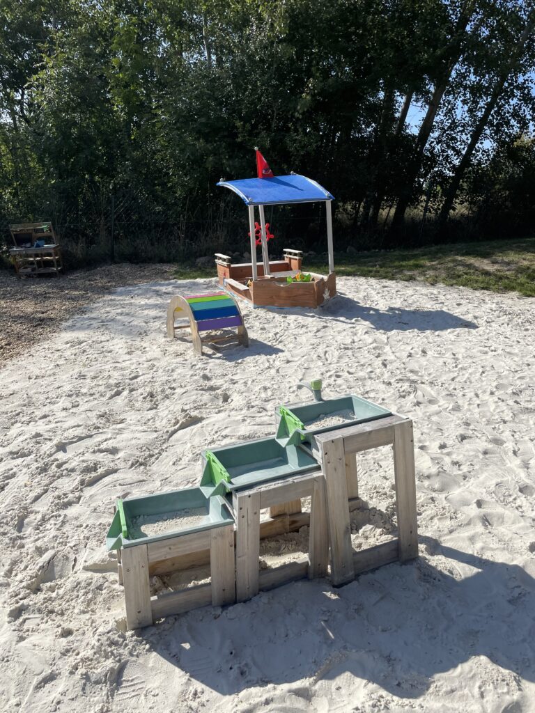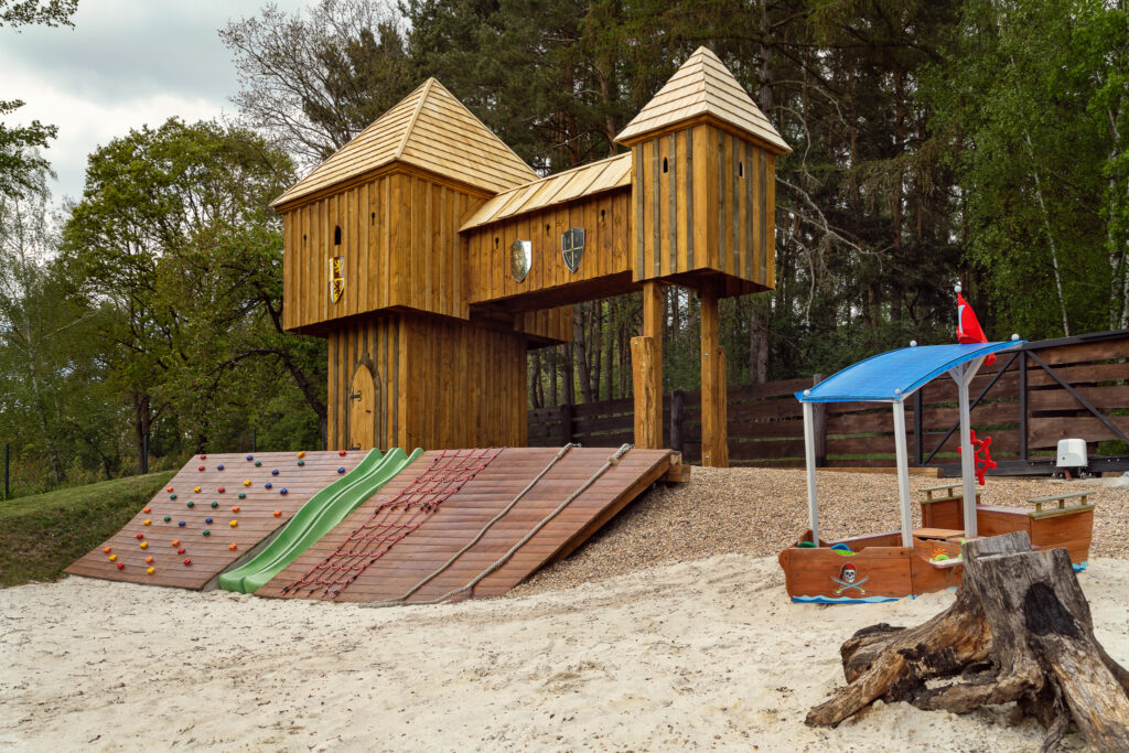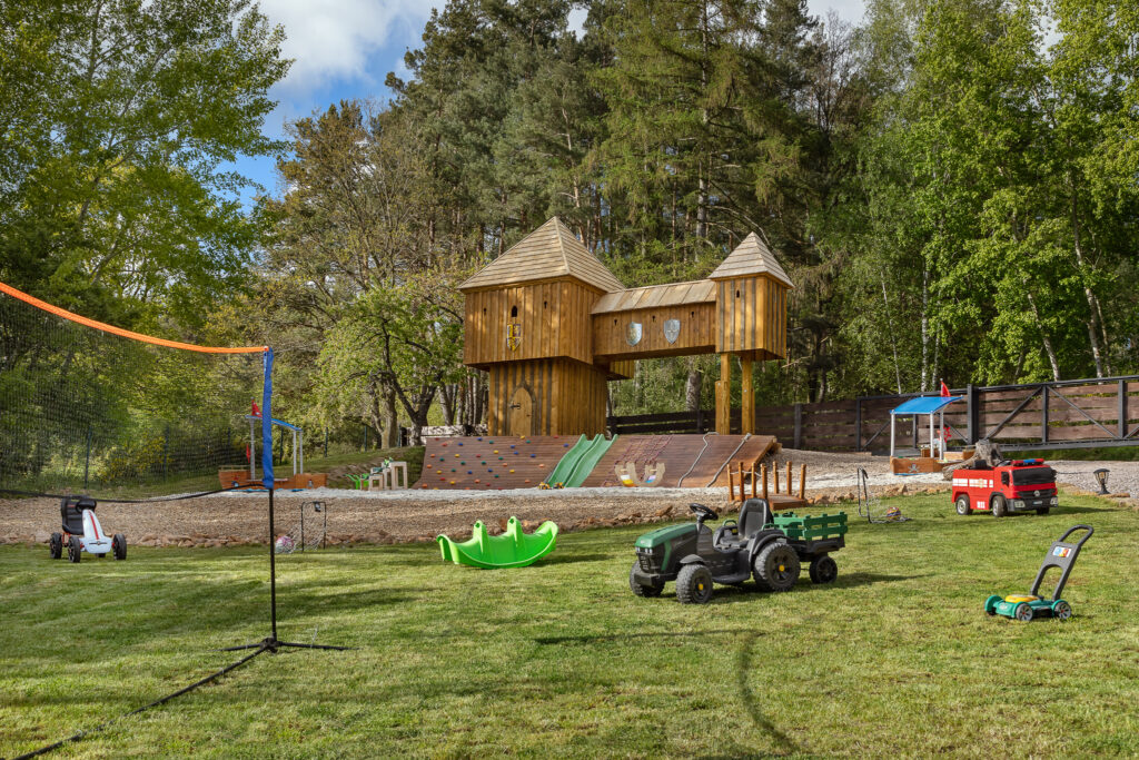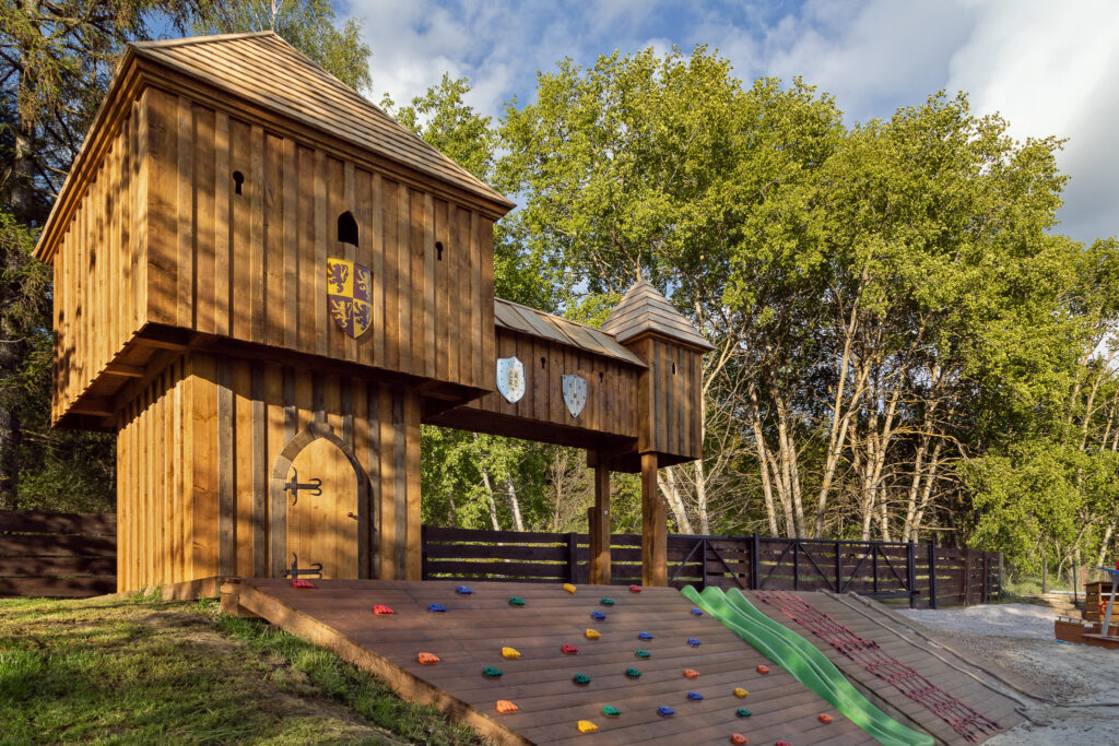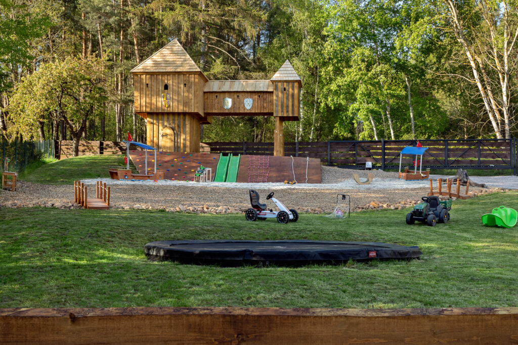 Venku je pak překrásné dětské hřiště, kterému dominuje hrad Kostík. „V přízemí je pro kluky připravená zbrojnice, kde se mohou stát opravdovými rytíři a pro děvčata je ve věži komnata, kde se díky krásným šatům promění v princezny. Starší děti v letních měsících mohou na Kostíku i přenocovat. Hrad Kostík stojí nad velkým pískovištěm. Písek symbolizuje vodní hladinu, ve které se nachází na mělčině uvízlé pirátské lodě, které sem zřejmě odnesly vodní proudy (možná druhohorního moře, které Český ráj tvarovalo do dnešní podoby 😊). Děti můžou začít své velké dobrodružství při bitvě s piráty a snažit se zachránit krásnou princeznu z hradu. Hned v sousedství této vodní hladiny najdete rozlehlou kamínkovou pláž s mosty, díky kterým děti překonají pomyslný vodní příkop. Po mostech se děti dostanou na travnatou část, kde se nachází trampolína, můžou si zde zahrát fotbal, tenis, uvařit něco dobrého v kuchyňce a kreslit křídou na tabuli.“ (zdroj) K dispozici jsou tu také elektrická a šlapací autíčka.