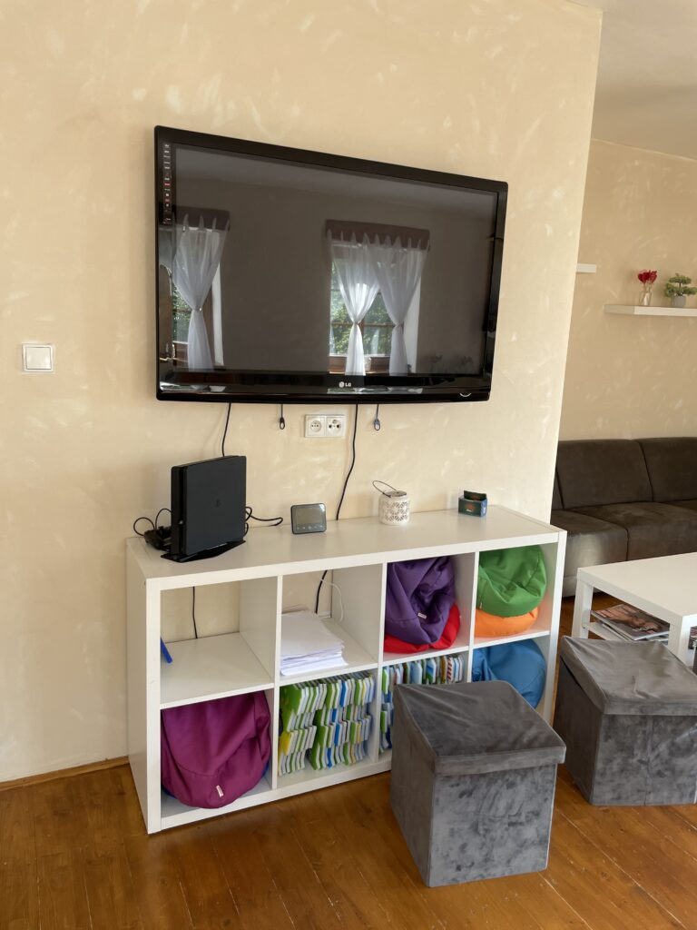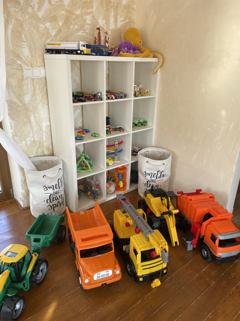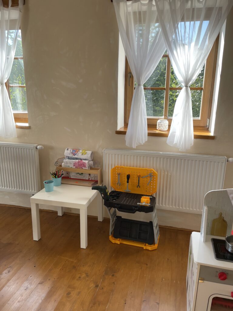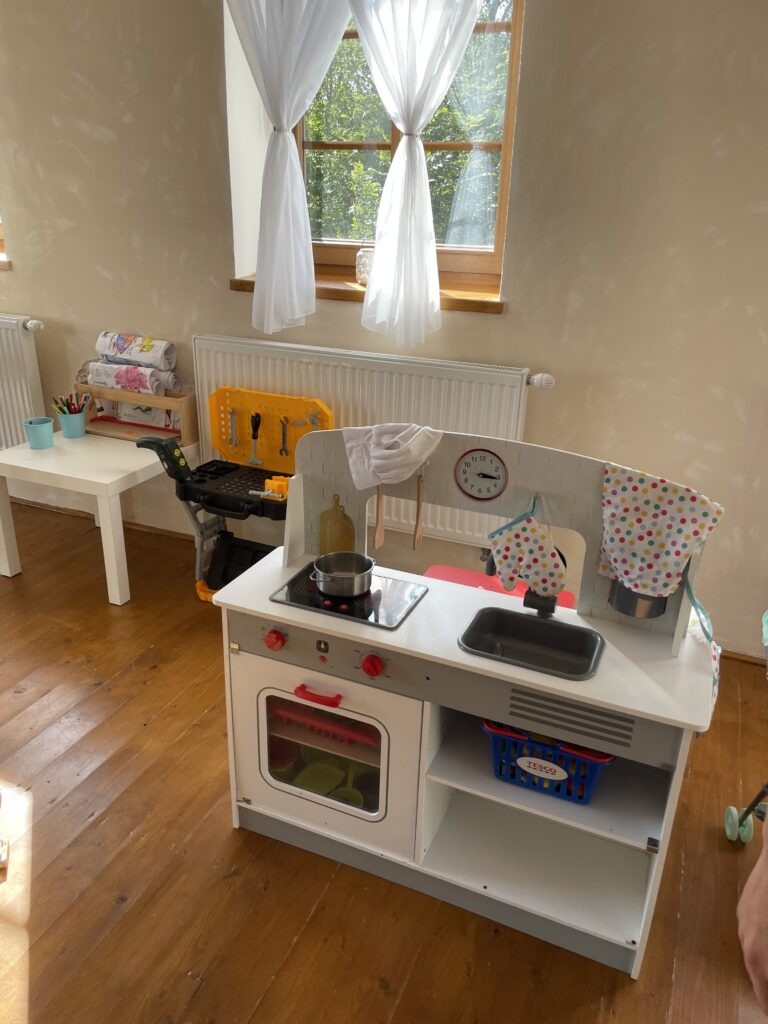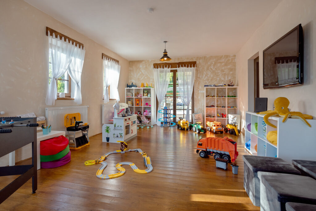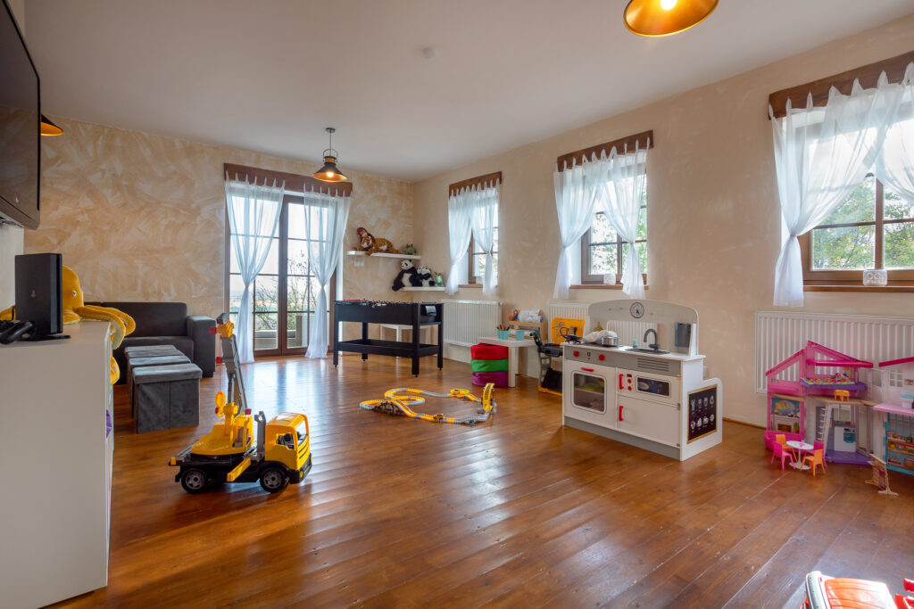 V přízemí na vás také čeká velká, plně vybavená herna. Najdete tam nejrůznější stavebnice, velká auta, dřevěné kostky, knížky (včetně těch s Albi tužkou), kuchyňku, kočárky, stoleček s potřebami na kreslení a také koutek se sedačkou a TV s hrací konzolí. Navíc je hned vedle na chodbě „kávový koutek“, kde si můžete připravit z kávovaru výbornou kávu a dochutit jí nejrůznějšími sirupy Monin a nebo si za 200,- zakoupit lahev moravského vína. Jediné, co bychom dali jako tip, co si vzít s sebou, je nějaký ostřejší větší nůž.