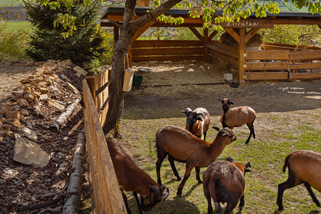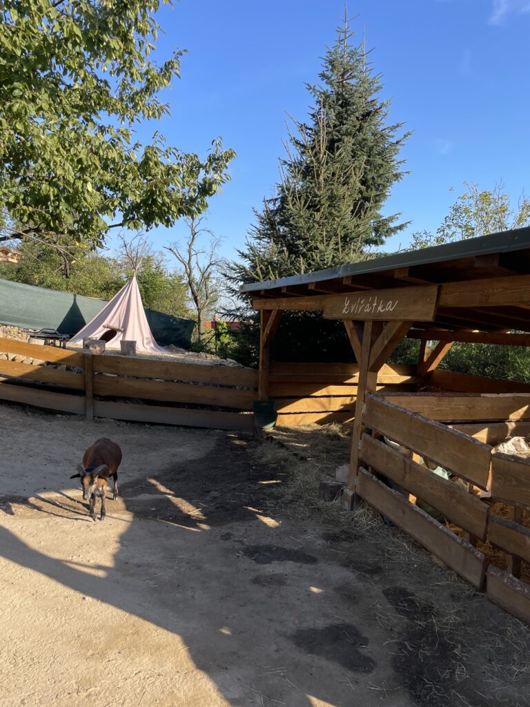 Aby toho nebylo málo, dole na zahradě je ohrádka se zvířátky, které si můžete pohladit, nebo je nakrmit. Najdete tu morčata, králíky, ovečky nebo beránky. Hned vedle je také teepee a ohniště na opékání a grilování.
