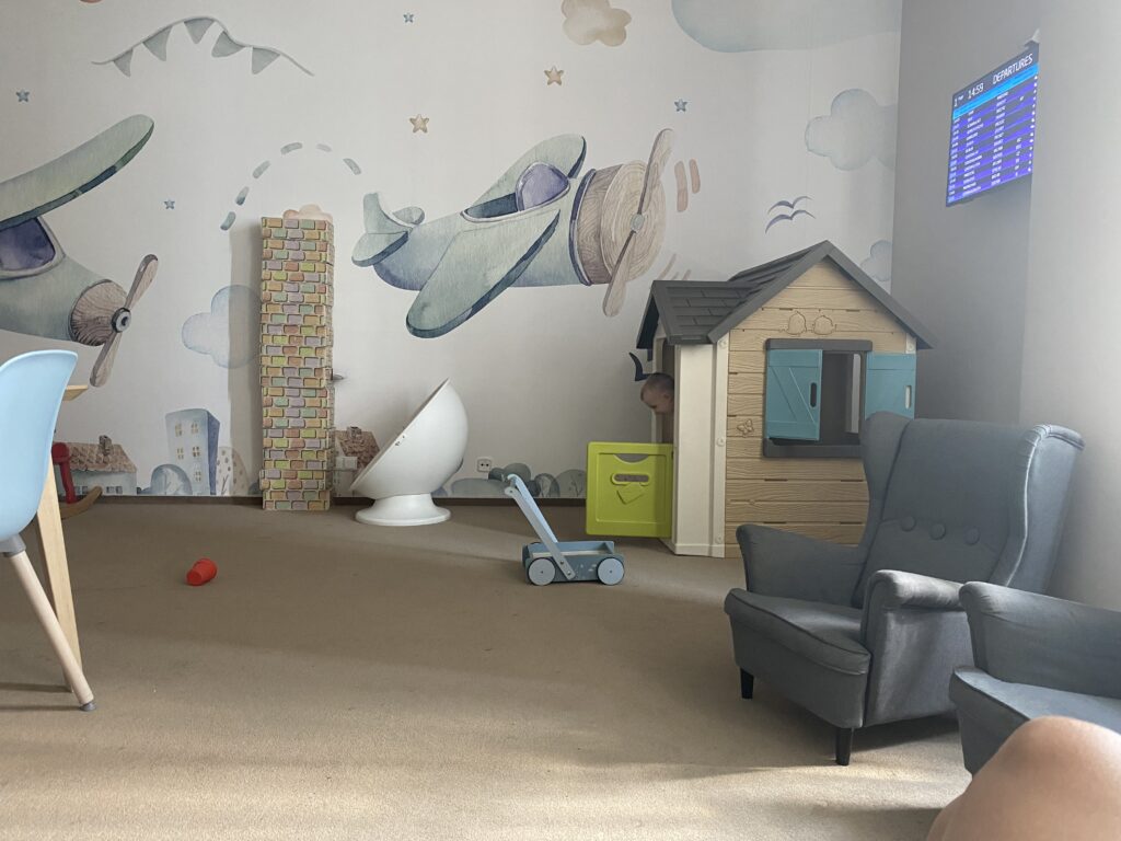 Letiště Václava Havla v Praze – na letišti najdete plno dětských koutků, malých zastávek pro děti (na směrovkách hledejte medvídka) a také místnost pro rodiče s dětmi -je na obou terminálech vybavena hračkami, přebalovacím pultem, mikrovlnou troubou (na směrovkách hledejte rodiče s dítětem za ruku). My využili místnost pro rodiče s dětmi, která se nachází ve 2. patře tranzitní části Terminálu 1 vedle Restaurace Runway.