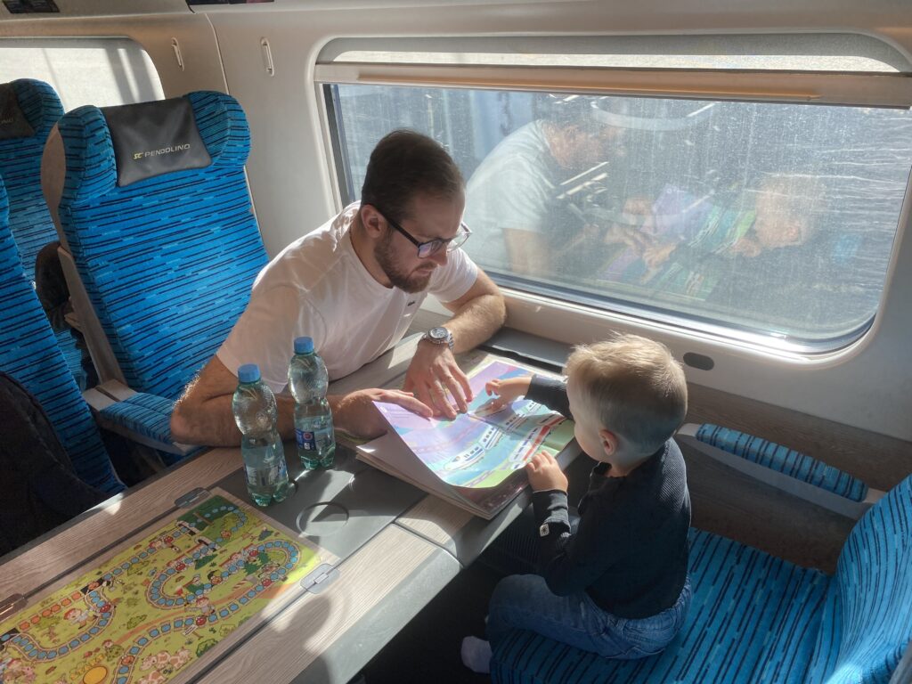 Regiojet- Regiojet má jako jediný doopravdické dětské kupé, kde je opravdu místo na to, aby si zde děti i pohrály. Běží zde tedy také televize s pohádkami, ale místnost už je malinko rozlehlejší než v případě např. Pendolina. Do tohoto vagónu si děláte rezervaci, která je většinou opravdu potřeba udělat s dostatečným předstihem. Pokud se vám to nepodaří, je možné sem s dětmi přijít a kouknout se na pohádku také, ale pouze se svolením cestujících, kteří v kupé rezervaci mají. Pro kočárek tu pak nikde, žádné vyznačené místo nebylo, skládali jsme ho tedy do rohu kupé.
