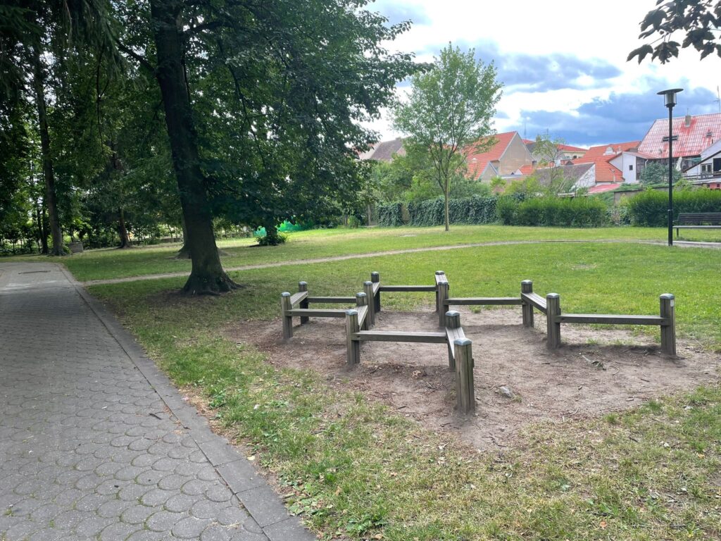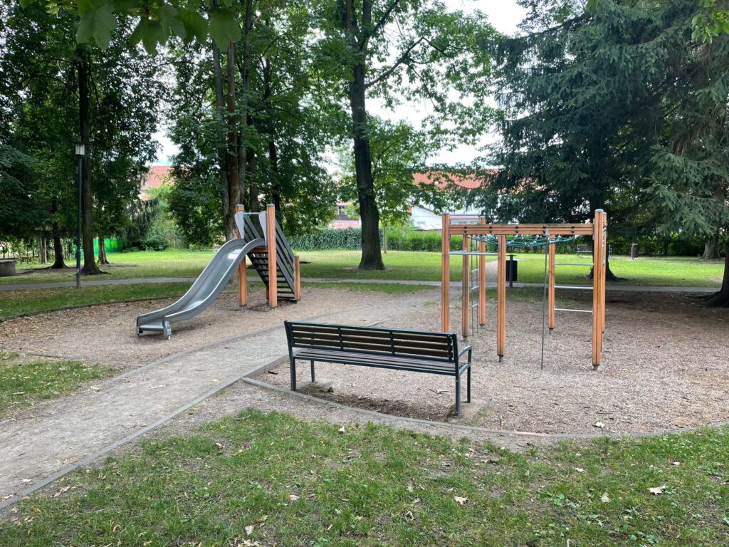 Hned za hřištěm se vydejte doprava nahoru kolem Gymnázia dále přes křižovatku a u mateřské školy zahněte doleva. Směrem k parku u Kina budete míjet Pekárnu PETA, kde nabízejí výborný kulatý chléb, nebo třeba podctivou ,,Plundru“kterou můžeme jenom doporučit. O pár desítek metrů dál začíná již zmíněný park a zde další DĚTSKÉ HŘIŠTĚ.