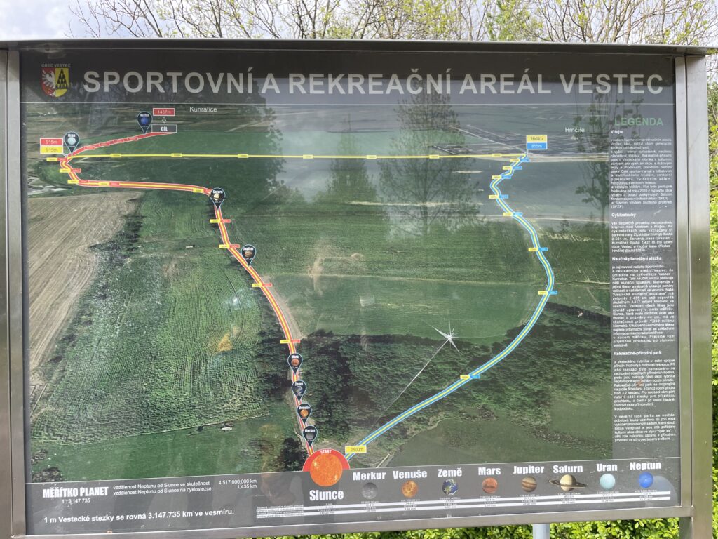 S sebou určitě můžete vzít kočárky, odrážela, kola nebo brusle a užít si 1,5 km dlouhou planetární stezku. Tahle stezka není okružní, okruh, který má 2,5 km, z ní uděláte, když se vydáte po žluté cestě (vyznačeno na mapce). Na tomto úseku mohou jezdit auta, provoz je ale minimální.